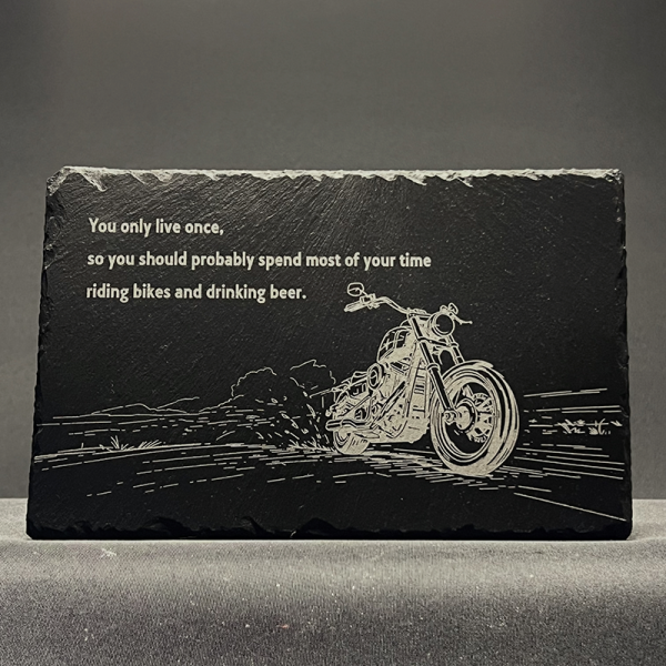 Stoere leisteen tegel met gravure: “You Only Live Once…” Perfect voor motorfans en bierliefhebbers. Uniek, duurzaam en verkrijgbaar in diverse maten.
